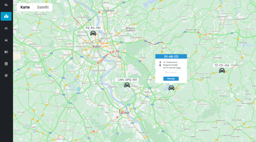 Du siehst die aktuellen Standorte deiner Fahrzeuge live auf der Karte, inklusive Fahrtenverlauf, Standzeiten und Nutzung. Zusätzlich stehen dir Auswertungen zu Fahrverhalten, Fahrzeugzustand und Wartung zur Verfügung.